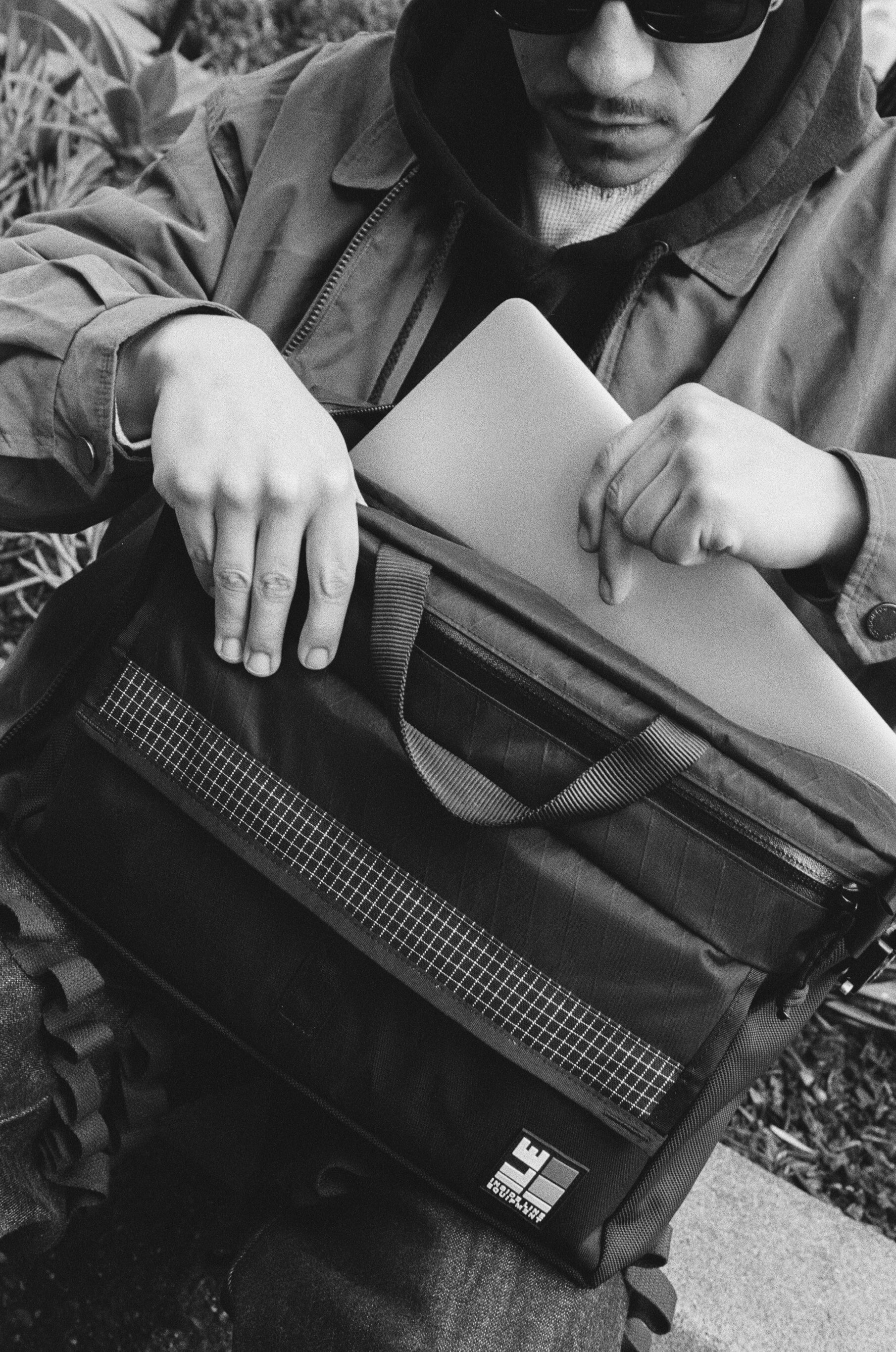 Blackout Patchwork pieces are made using panels of four hard-wearing, weatherproof fabrics: VX21 XPAC, X50 XPAC, 500D Cordura / 275 Dyneema Ripstop, and 1050D Ballistic Nylon. To maximize functionality the fabrics appear in a gradient from heaviest at the bottom to lightest up top.